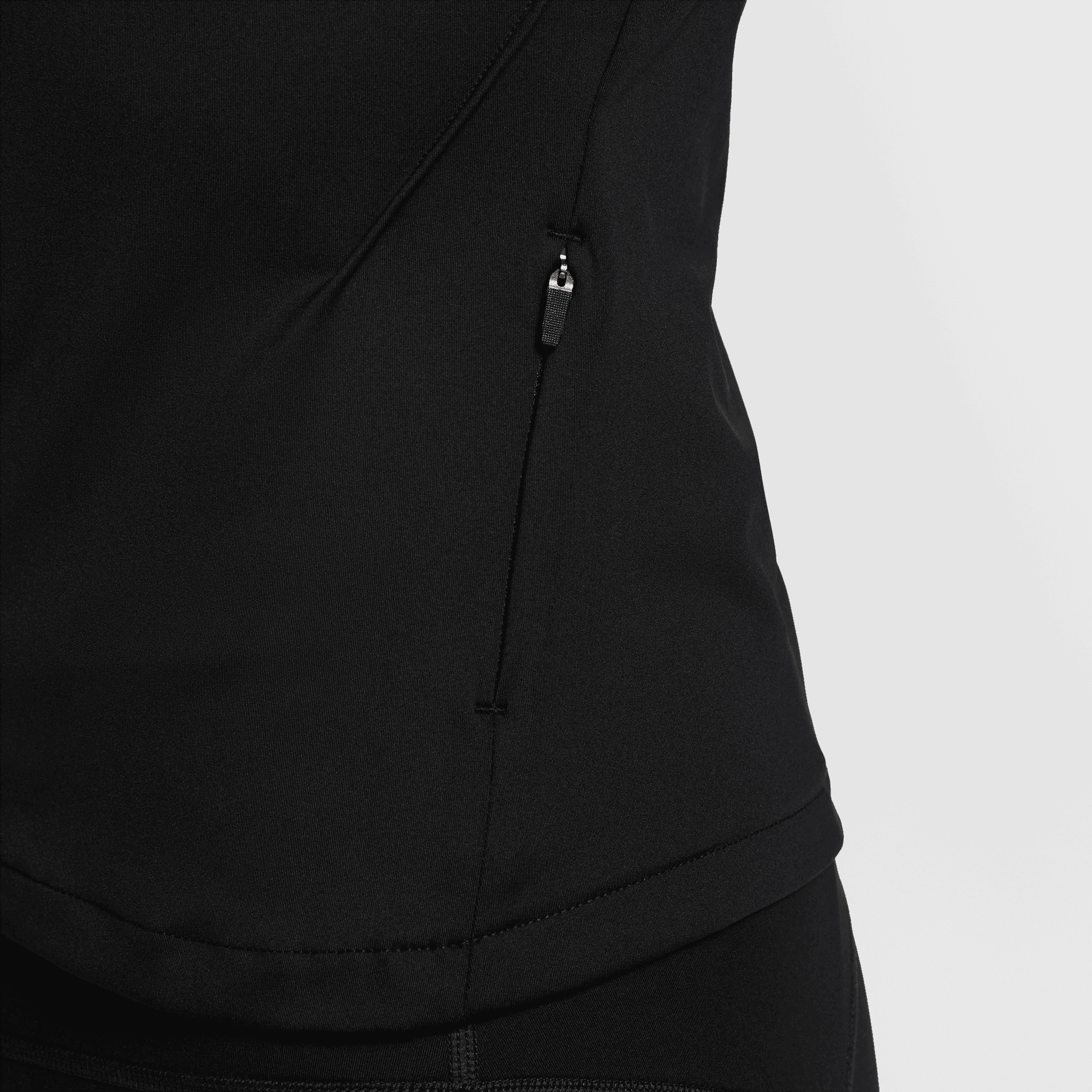A slim fit that tapers around the waist makes layering with other pieces easier. Thumbholes let you extend your coverage and help hold the sleeves in place. A zip pocket on the left side seam fits items like earbuds, a key or a card.