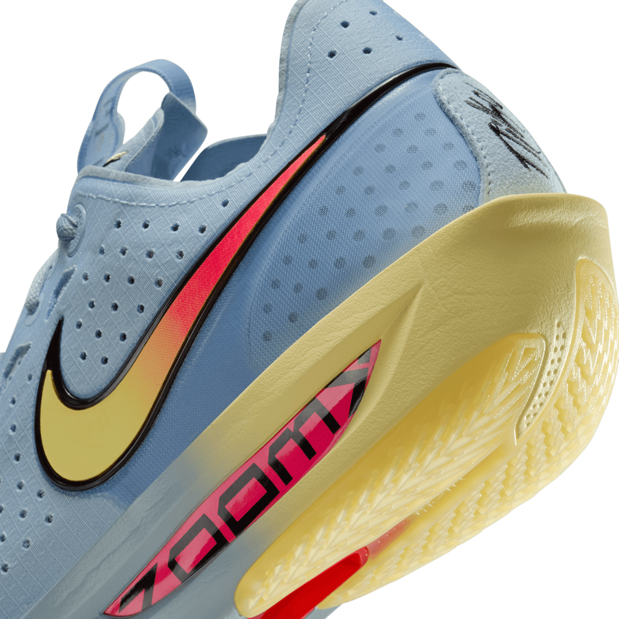 For the first time in our Basketball history, we implemented full-length ZoomX foam that delivers Nike’s highest energy return. A smaller plastic plate on the pinky-toe side of the forefoot helps keep your foot stable when making sudden movements.