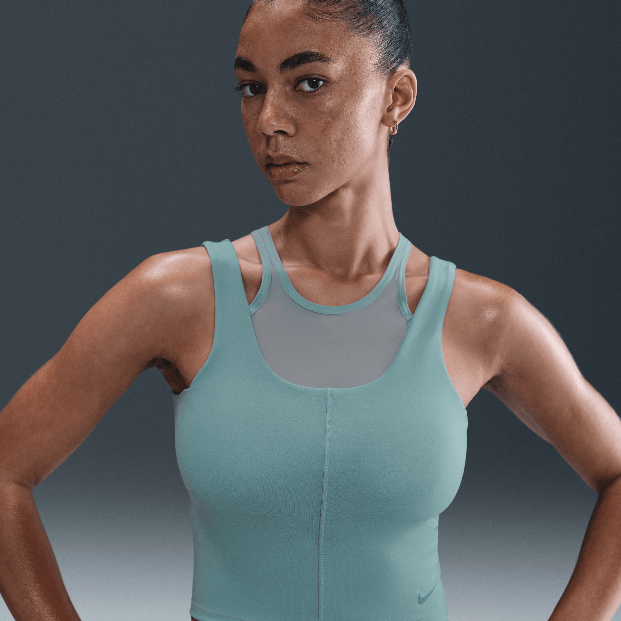Nike Dri-FIT technology moves sweat away from your skin for quicker evaporation, helping you stay dry and comfortable. A sheer panel on the chest offers breathability with a bit of subtle coverage.