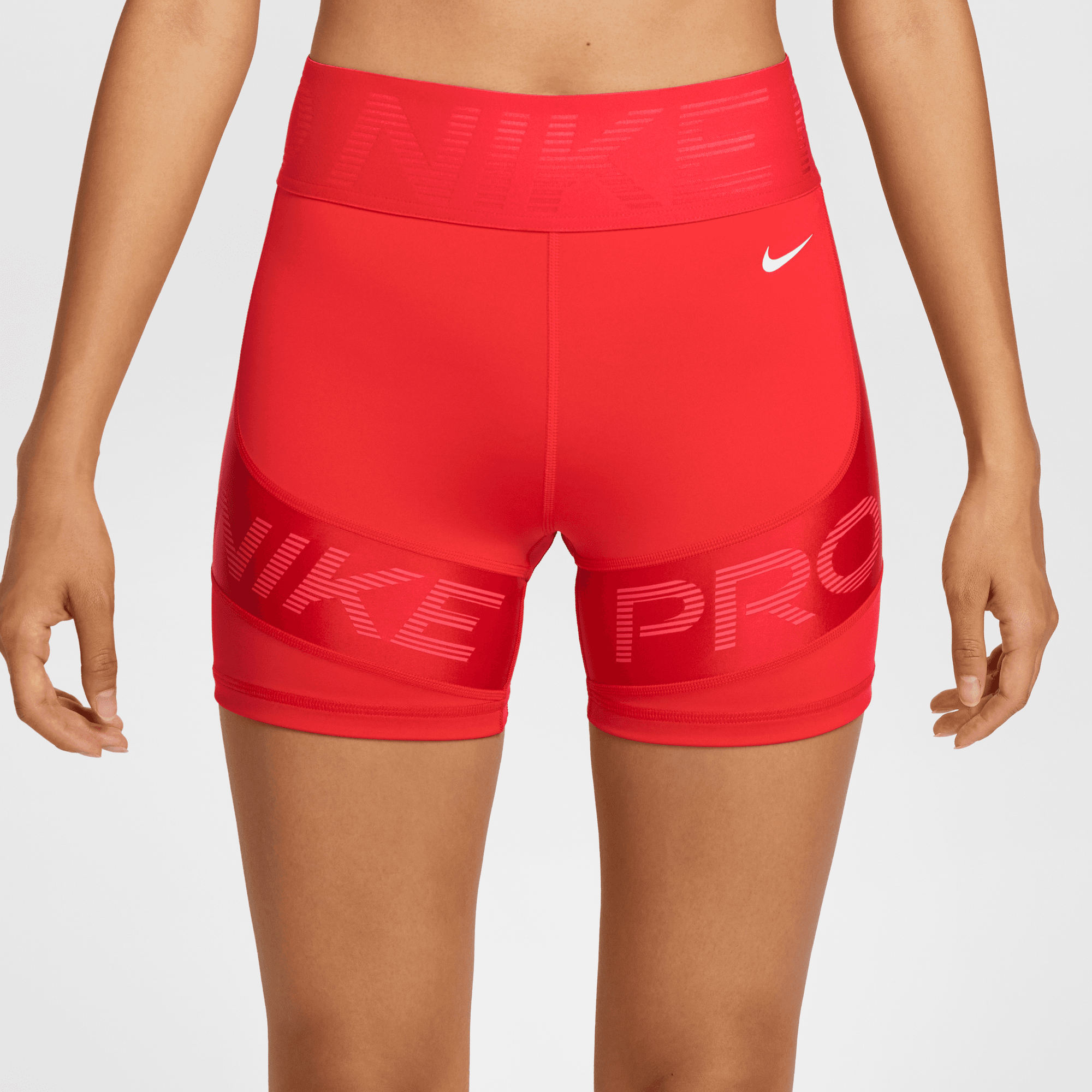 Work hard and stand out in these sweat-wicking biker shorts. Thicker and stretchier than our classic Nike Pro material, midweight fabric delivers a smoothing sensation while an extra wide waistband and sleek, shiny panels elevate your look.?